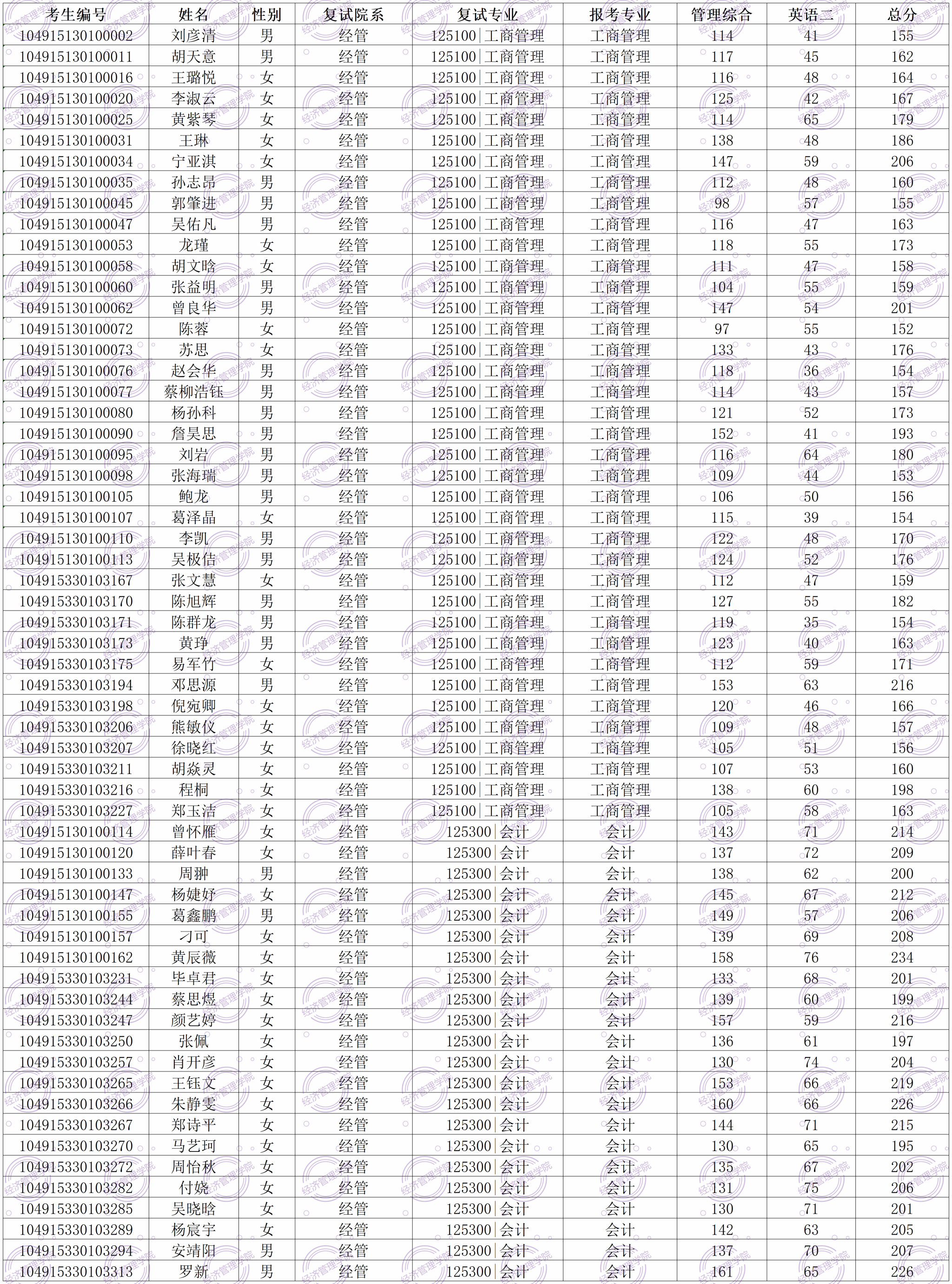 2.工商管理专业复试成绩=(思想政治理论成绩+面试成绩)÷2