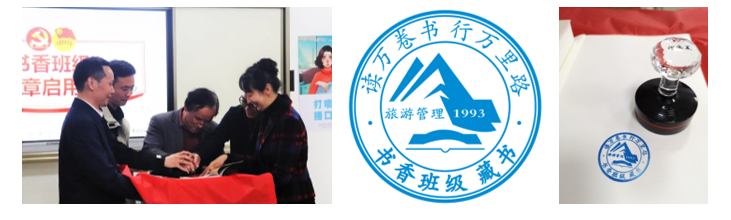 为标识、管理和传承藏书,本次活动启用了为旅游管理“书香班级”特别设计和刻制的藏书章。藏书章由旅游管理系党支部书记李江敏老师、系主任肖拥军老师呈出,由徐世球教授、李少杰副书记和赵家玮老师三位嘉宾共同为“书香班级”入藏图书盖上第一枚印章。旅游管理“书香班级”藏书章以蓝色为主题色,中心图案由书、山和旅游管理学科三元素构成,周边刻有“读万卷书,行万里路”这一为人熟知的关于“阅读”与“旅行”的信条,拟以“书香旅途,阅见世界”为“书香班级”品牌理念形象。