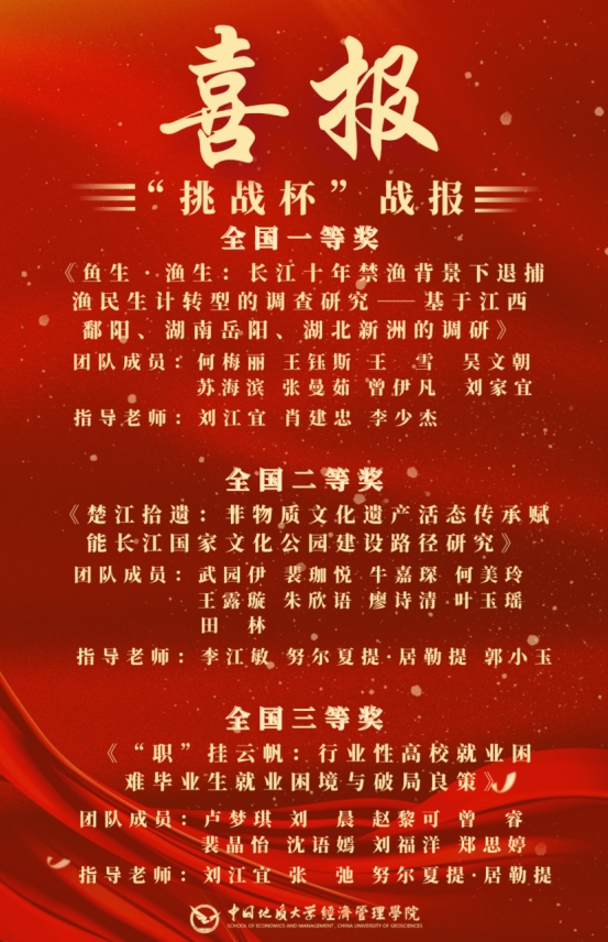 项目简介:“江研境学”团队是一支由跨学科、跨专业的14名本科生组成的长江保护小分队。团队成员们梳理长江十年禁渔计划的实施背景及相关政策,选取江西鄱阳、湖南岳阳、湖北新洲等三个典型代表区域,通过文献研究、访谈调查、问卷调查等方式,以SLA实证分析框架对禁渔计划的执行和退捕渔民生计转型进行调查研究。经过深入剖析,他们还提出多条政策建议,为帮助退捕渔民实现高质量生计转型提供参考依据,作品得到农业农村部长江流域渔政监督管理办公室等相关政府部门、研究机构及企业的肯定与采纳。