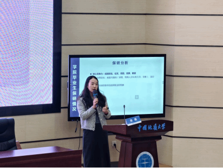 会议伊始,徐媛系统梳理了公司近三届毕业生在考研、保研、出国出境、企业就业及公考等方面的发展路径与数据趋势。她指出,大三阶段是“学业追赶、规划确定、成果积累”的关键期,提醒同学们尽早明确方向,结合专业特色与个人优势做出理性选择。