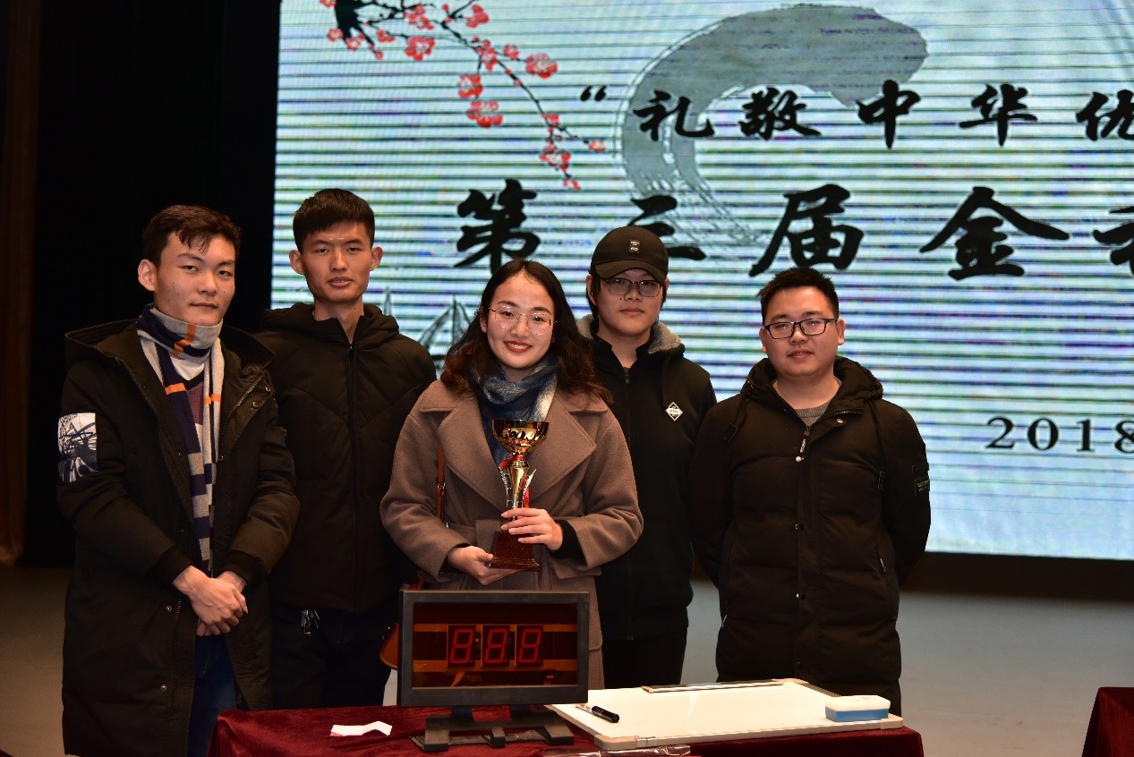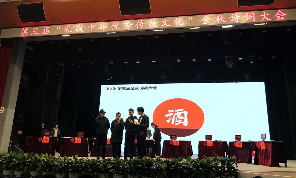 12月11日的决赛现场,公司“浪淘沙”团队经过“江山代有才人出”环节精彩亮相,在“万紫千红总是春”环节获得累计得分第二名,而后在“歌尽桃花扇底风”环节反超成为累计得分第一名,并在接下来的“狭路相逢勇者胜”、“柳暗花明又一村”环节中保持最高分数。在“万紫千红总是春”的决胜环节,题目为“酒”字飞花令,团队成员夏益骏同学出战,以渊博的诗词储备量击败对手,代表太阳成集团122ccvip荣获第一名的佳绩!