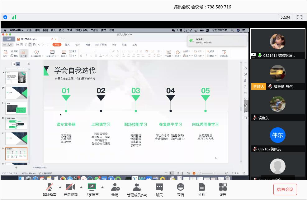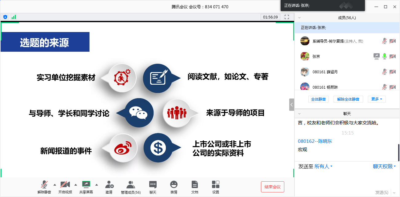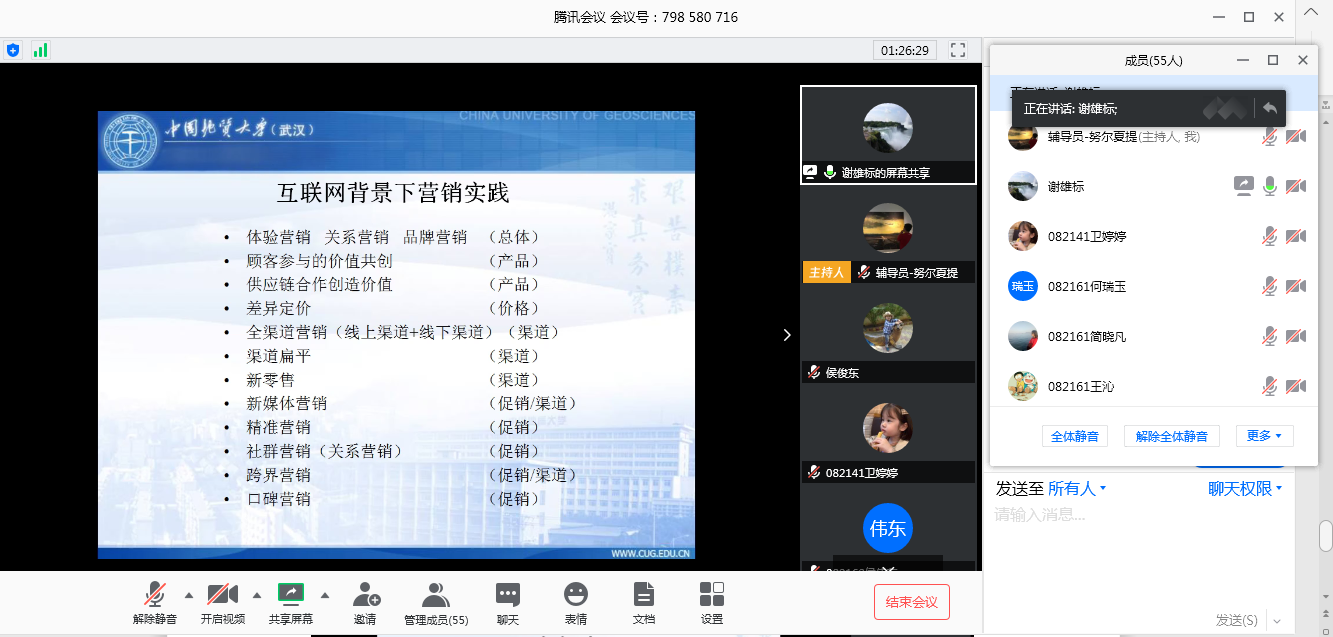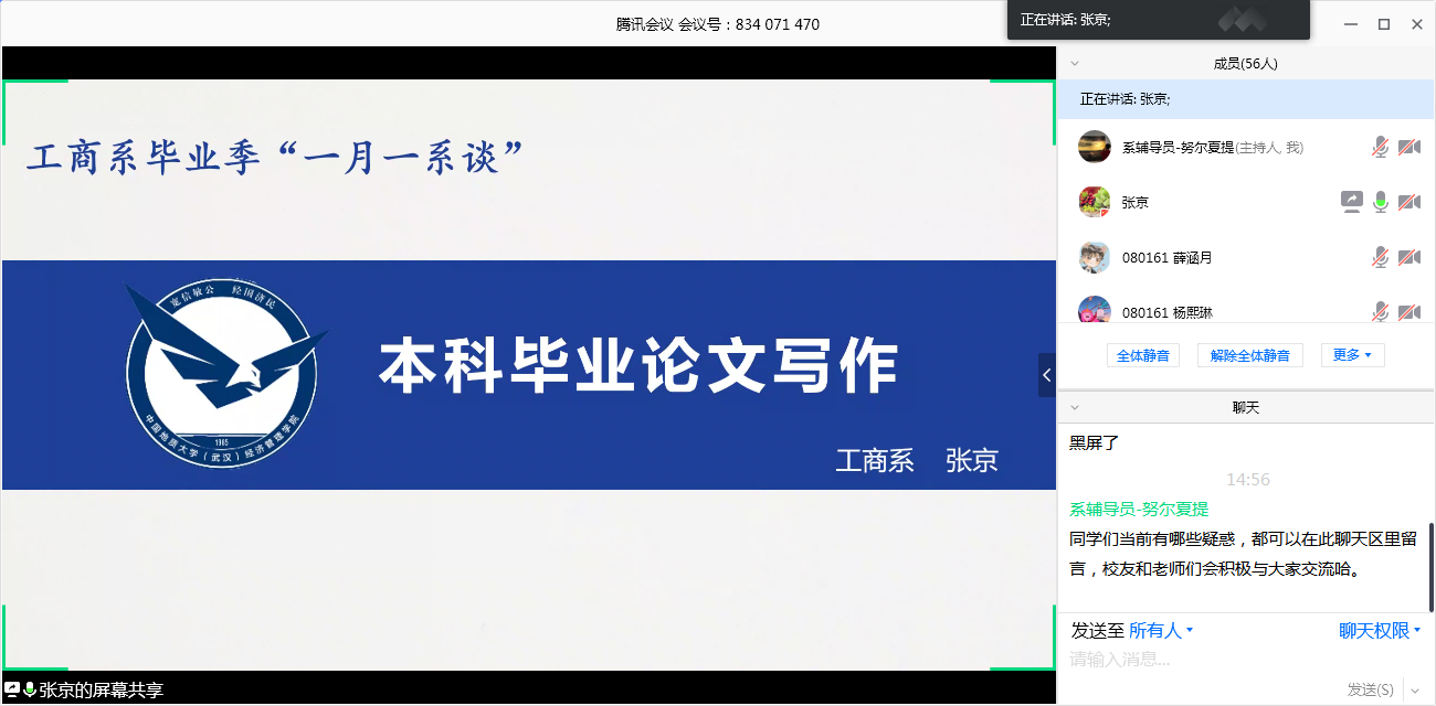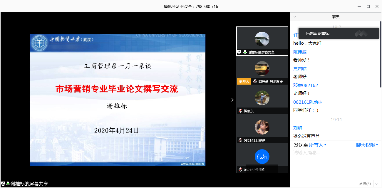 参加活动的同学们对各位老师的谆谆教导纷纷表达感激之情。至此,主持人宣布活动,腾讯会议室的人数却基本没有变化,毕业生们对地大、对经管的依依不舍,对工商系老师们的恋恋不舍场面,一时让人十分感动。