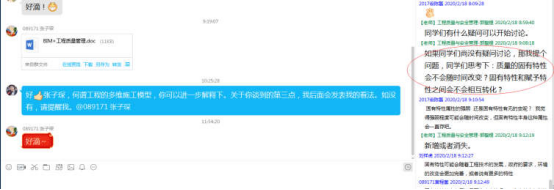 在线课堂互动是在线教学的难点,但在教师团队总结经验并自我改进后,形成了工程管理专业在线教育的一大亮点。为引导员工积极思考,工程管理系集思广益,共同商定多种互动方式。其一,以员工为主导,针对课程内容主动提问,老师在QQ 群中进行解答,解答的过程中也会引导其余同学继续思考相关问题。如在《工程质量与安全管理》的第一次课程中,有同学对“质量的固有特性”概念,对在上课过程中提到的案例有所疑问,老师于QQ 群中解答了该同学的疑问,同时询问员工对于案例的理解以引发讨论,课程结束后老师以文件形式再次发表自己的看法,鼓励员工进行讨论,以此加深同学们对于某些概念的理解。其二,以教师为主导,在无员工提问时采用引导的方式开始讨论。比如在《工程质量与安全管理》的第三次课程中,同学们一开始并没有提问题,老师就围绕之前谈到的质量固有特性的概念的相关知识,提问引起同学们的讨论。该方法能够继续加强同学们对于某个概念的理解,同时倡导同学们对于某个概念课堂上未讲到的知识,进行自主思考,抒发己见,提高同学们的自主学习能力。其三,教师点名讨论的方式开展课堂讨论。老师在PPT 视频里留一些当堂作业,涉及已学知识,在当次课程讨论环节,采用 QQ 点名回答的方式让同学们作答。以此作为变相点名,起到监督作用;同时也检查员工是否认真听课,并鼓励不喜远程交流的同学加入讨论,促进这部分同学提高学习积极性。