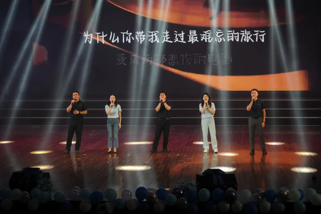 努尔夏提老师、徐媛老师、蔡杨老师、陈静老师和张弛老师登场献唱《突然好想你》,熟悉旋律瞬间点燃全场情绪。台上台下齐声合唱,不舍之情在歌声中流淌。歌曲尾声,辅导员们真挚的毕业祝福,更是为这场青春告别仪式,添上了最温暖回忆