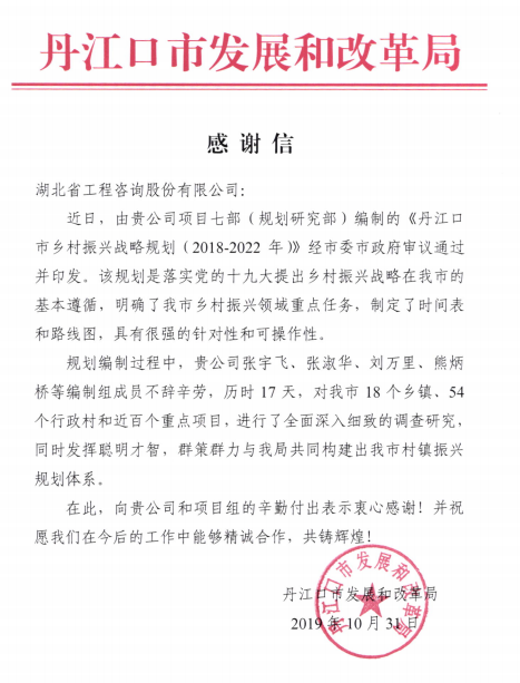 丹江口市发展和改革局向刘万里员工单位发送感谢信