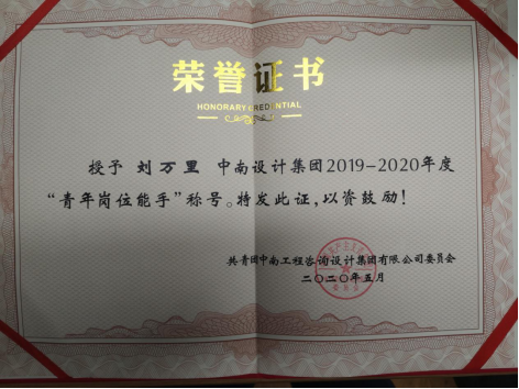 刘万里员工单位“青年岗位能手”荣誉