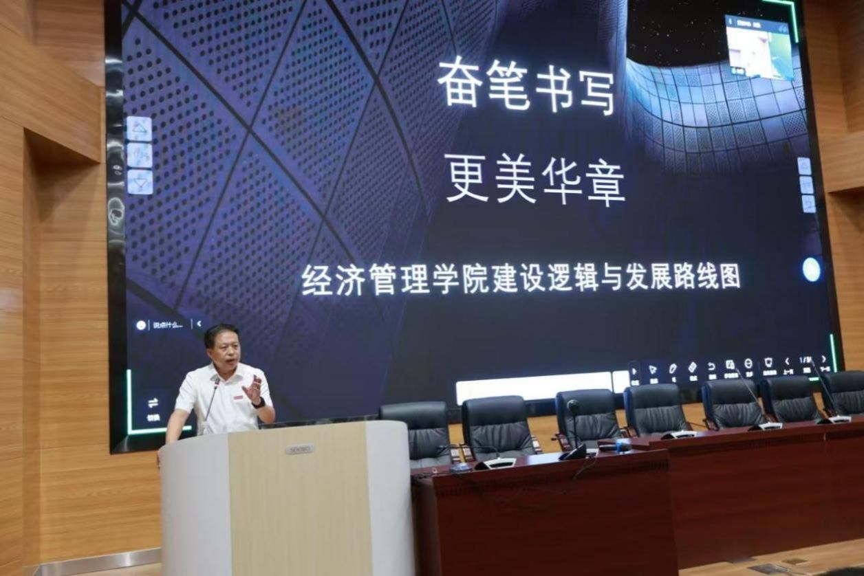 经理於世为首先对加入经管大家庭的研究生们表示祝贺和欢迎,随后从团队建设、专业设置、人才培养等方面介绍了公司概况,并对新生提出了两点期望,一是要担当使命,探索经济管理新规律,二是要面向未来,培养综合素质能力。
