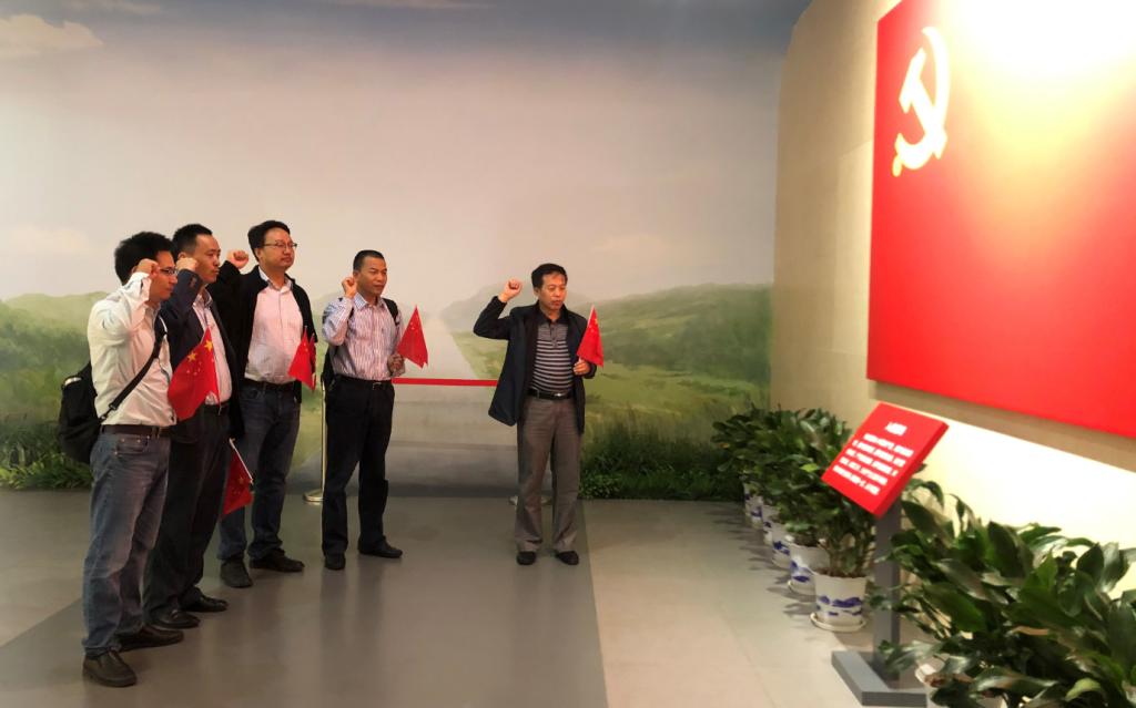 在参观结束前,公司领导班子成员在党旗下重温入党誓词。铮铮誓言在大厅里回荡,鲜红的旗帜映衬着接踵而至的党员和群众,肃穆的展馆显得越发的高大威严。