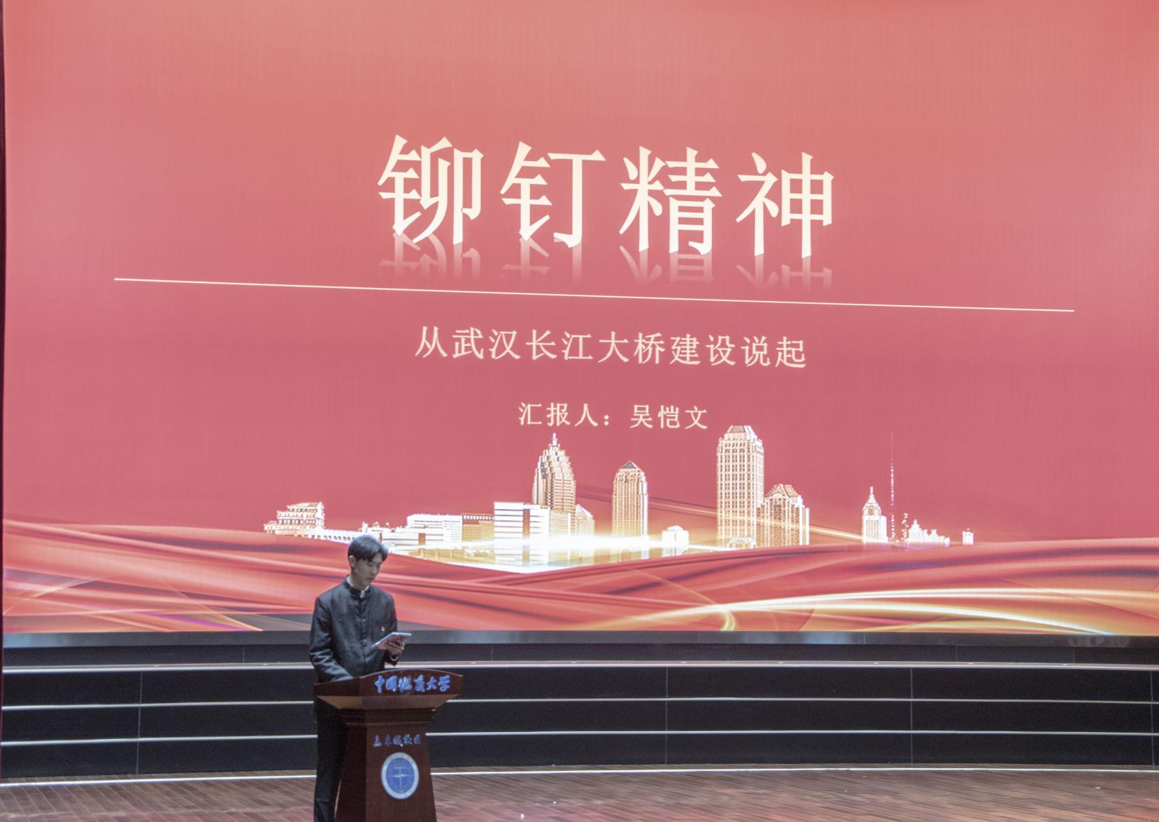 市场营销专业本科生吴恺文将自己在央视录演的《红色文物青年说》节目带到活动现场,带来了一场生动的微党课。他以青年人视角、故事化讲述、创新性呈现的特色,回顾武汉长江大桥的艰难建造史,讲述党带领全国各地的优秀桥梁专家和建设人员攻坚克难、筚路蓝缕的红色故事。他说,从北京录完节目回武汉时,火车正好驶过武汉长江大桥,飞驰而过的短短几十秒,他仿佛又看到了大桥建设时的火热场景,看到了党员同志们一同攻坚克难,听到了铆钉风枪和跳动风顶工作的阵阵铿锵声。